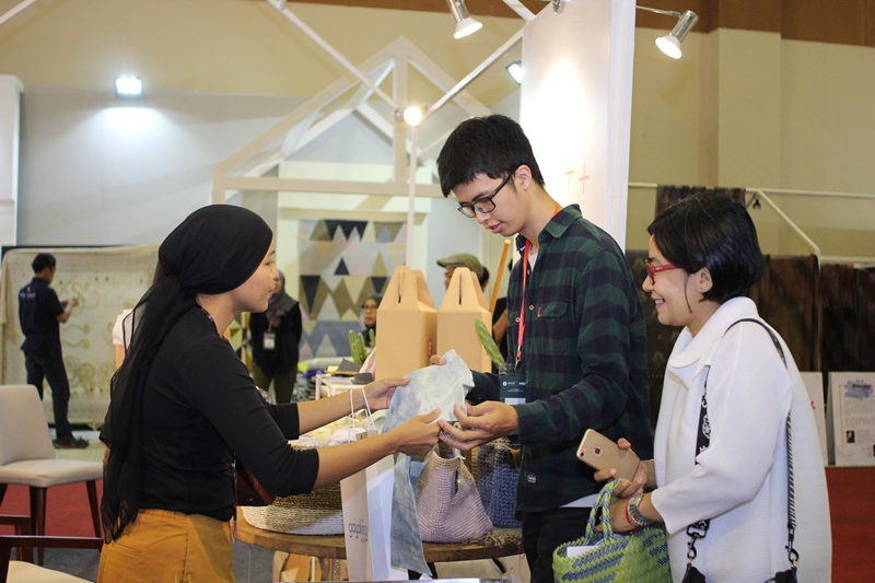 Pengunjung bertransaksi di salah satu booth. Pada hari terakhir penyelenggaraannya, pameran INDEX MOZAIK Indonesia        (8/10) dibuka untuk pengunjung umum